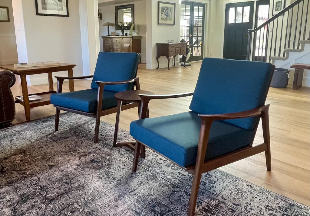 The Charlotte Mid Century Modern chair features a solid walnut frame carefully crafted by skilled carpenters. The beauty of the natural walnut wood grain is paired with the gracefully sculpted arm rests and details front and back that differentiate this piece from mass-produced look-alikes. Further distinguishing the Charlotte chair is it's updated dimensions that maintain the mid-century design ethos but offer a slightly higher back and generous seat width for enhanced comfort. The upholstered seat cushions are high-density foam wrapped in dacron batting and upholstered in a selection of fabric color options. The seat is supported by a webbing foundation.